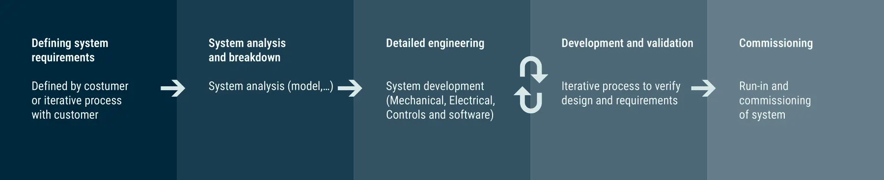 Utvecklingsprocessen för mekatroniska system kan delas in i 5 steg som tillsammans täcker hela förloppet från kravspecifikation till styrning av det färdiga systemet.